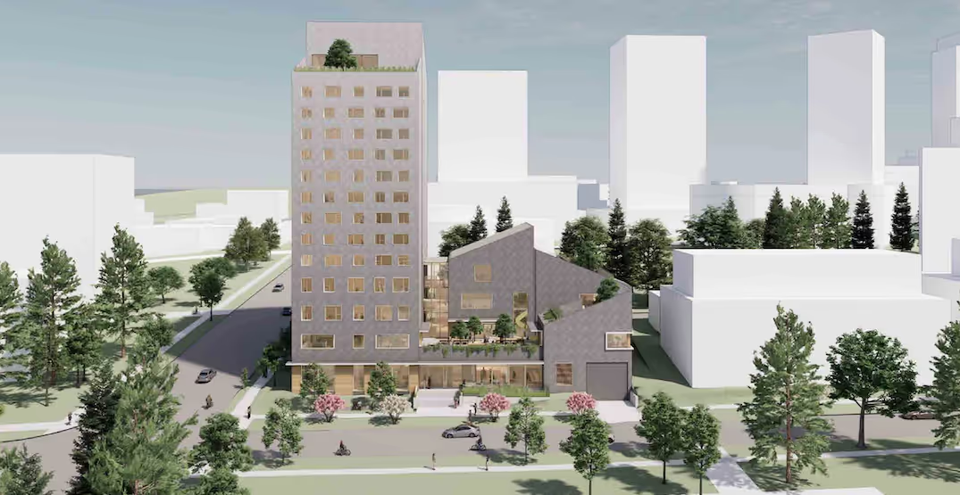 Designed by Michael Green Architecture, the tower aims to be “architecturally synonymous” with the existing Heather Street facility, also created by the same architectural design firm. It features a “playful” design with pitched roofs and a pattern of punched windows.