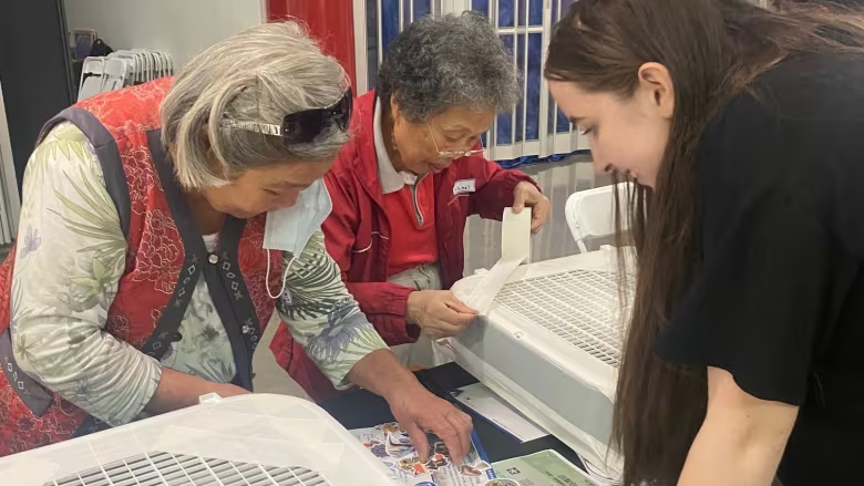 Volunteer Lyra Murphy shows seniors at the Chinatown Plaza in downtown Vancouver how to build a DIY air cleaner. The B.C. Lung Foundation is leading the workshops for people who are more vulnerable to the effects of wildfire smoke. (Dannielle Piper/CBC)