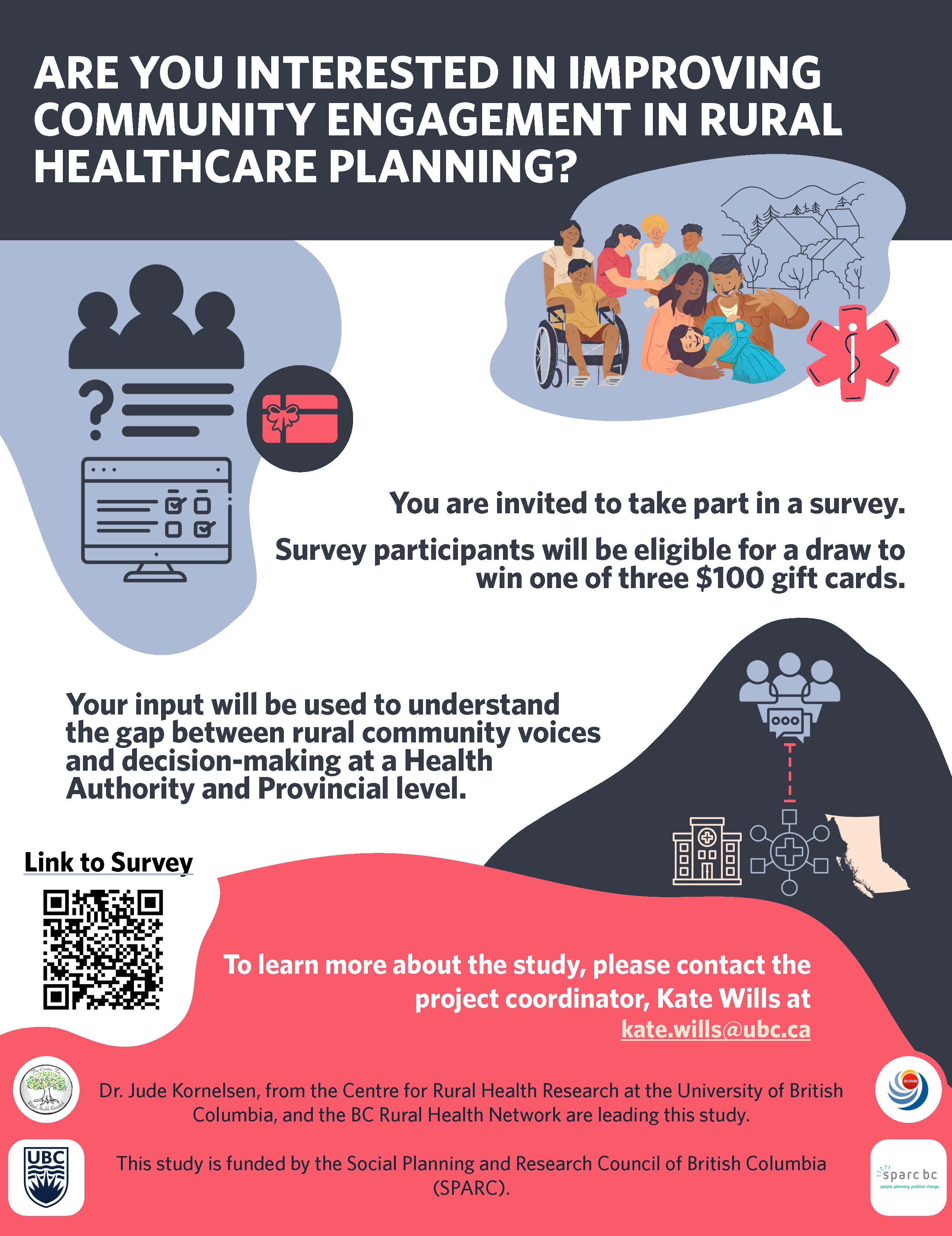 Your input will be used to understand the gap between rural community voices and decision-making at a Health Authority and Provincial level. Survey participants will be eligible for a draw to win one of three $100 gift cards.