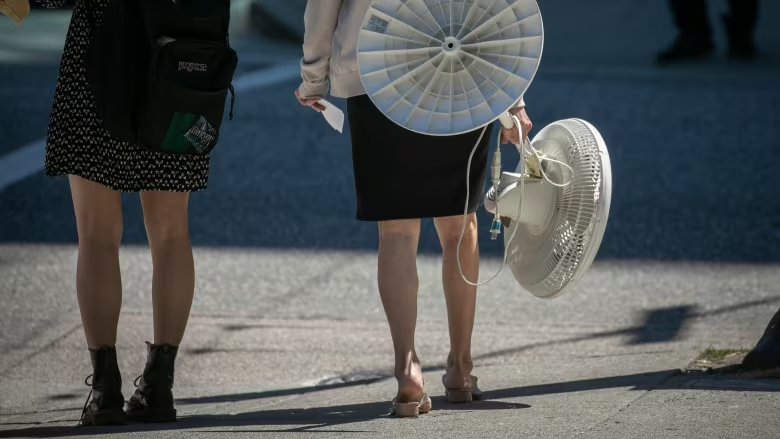 A woman walks with a fan during a period of hot weather in Vancouver, British Columbia on Monday, July 25, 2022. (Ben Nelms/CBC)