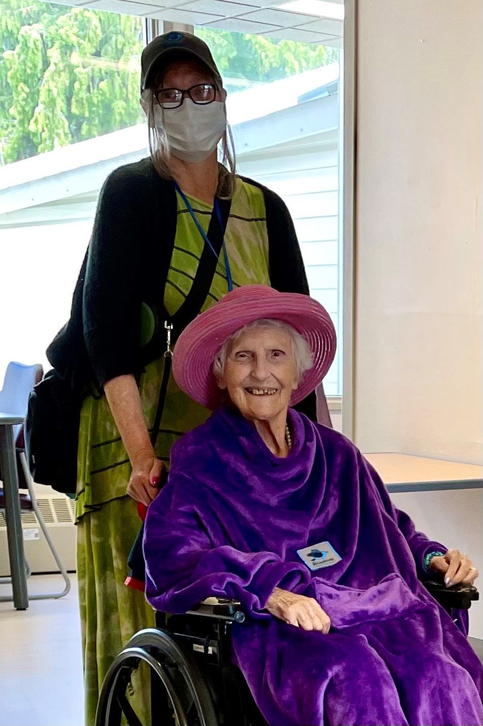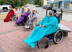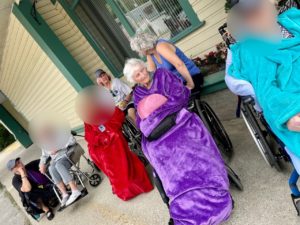 “The Bluebird Pavilion Volunteers are dedicated to getting as many residents outside as often as possible. Weather and wheelchair propulsion units (aka Bluebirds) are the limiting factors. Our buddies may be seen sporting their new Bluebird exclusive rainbow robes. We have equipped them with caps, light blankets and rain capes as well.