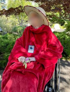 This article will be about the robes we’ve created for taking our residents on outings around town. We call them “Bluebird Bunny Bags” because they look cute as bunnies in them.