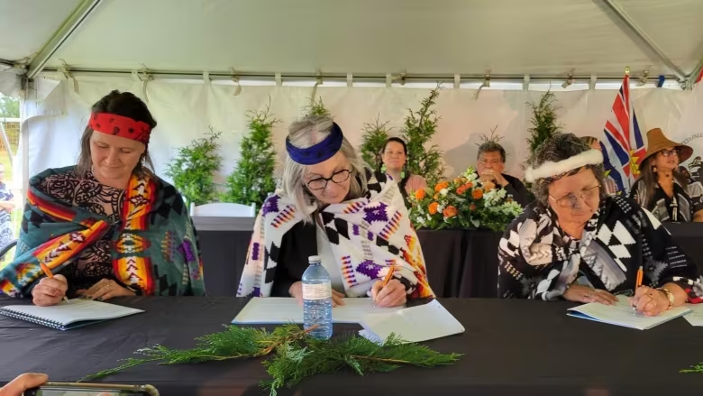 Left to right: Grace Lore, B.C. minister of children and family development, Patty Hajdu, minister of Indigenous services, and Cowichan Tribes Chief Cindy Daniels (Sulsulxumaat) are seen signing a co-ordination agreement that transfers responsibility for child welfare services to the nation. (CNW Group/Indigenous Services Canada)