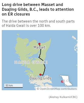 Disney says if the ER on the northern end of the island is closed, Masset emergency responders may decide to take their patient south to the Haida Gwaii Hospital in Daajing Giids, a drive that is over 100 kilometres along Highway 16.