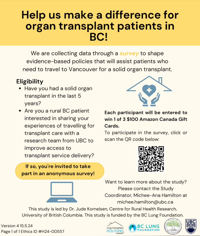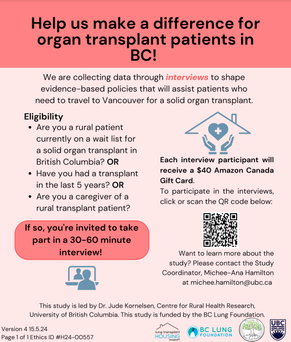 We continue to work with many others organizations to make transplants more accessible for rural residents in BC. We need your help! If you have had a transplant, if you are on the transplant list or is you are a care provider to a transplant patient we want to hear from you. If you know someone who might fit please share this post.