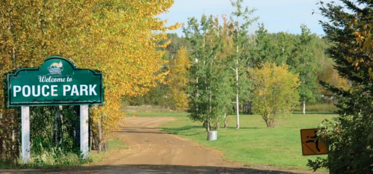Pouce Park, located just outside of the boundaries of Pouce Coupe, is a day-use park for families and nature enthusiasts. In the summer, the park is the destination for weddings and family gatherings, and in the winter, it is enjoyed by cross-country skiers. There is a playground, a bandstand, picnic tables, outhouses, and garbage and recycling bins. The green space is approximately 20 acres of maintained grass, trees for shade, and the Pouce River running through the east boundary.