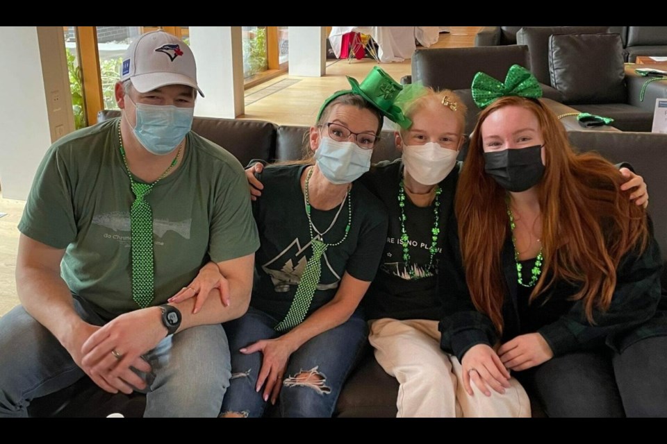 Jocelyn Kerr, third from the left, was diagnosed with cancer in 2021. She and her family spent 172 days at Ronald McDonald House during her treatment at BC Children’s Hospital. From left is Geoff Heppner, Carlene Heppner and on the right is Jocelyn’s sister Mackenzie Kerr. This was taken during a celebration for St. Patrick’s Day in 2021.Ronald McDonald House photo