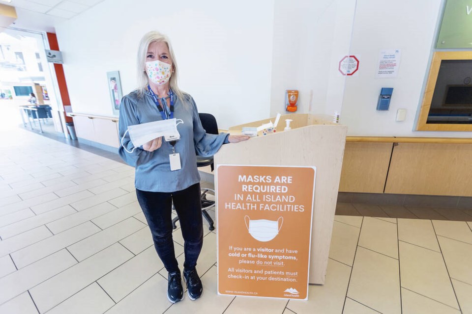 Island health patient ambassador Avril Oldridge hands out masks at the entrance to the Patient Care Centre at Royal Jubilee Hospital last October. DARREN STONE, TIMES COLONIST