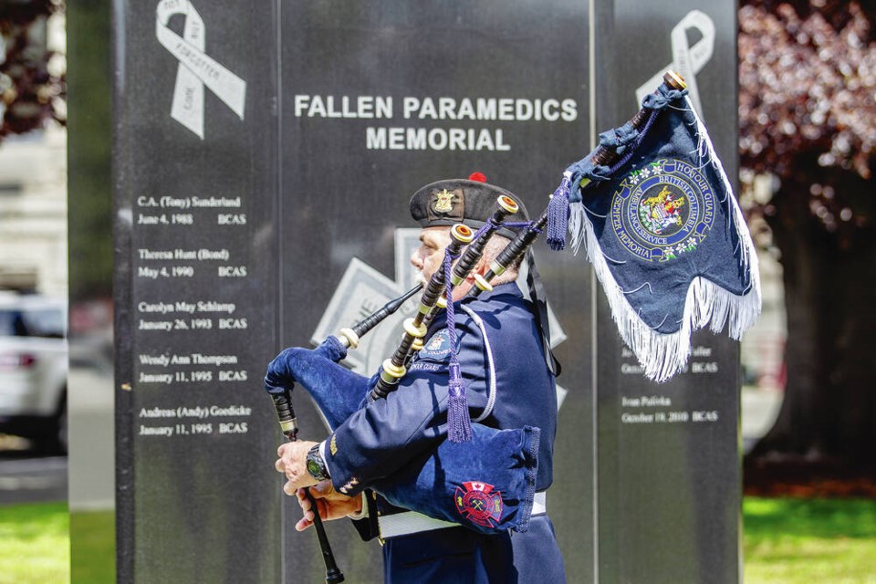 BC Ambulance honour guard company sergeant major Mike Wright plays bagpipes during the annual ceremony at the B.C. legislature to honour paramedics who have lost their lives in the line of duty. DARREN STONE, TIMES COLONIST