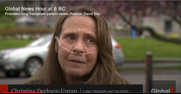 A Princeton woman in dire need of a double-lung transplant has met with Premier David Eby, advocating for residents outside of the lower mainland in desperate need of care. Christina Derksen-Unrau says she had to take herself off the transplant list after being asked to prove she could afford to relocate to Vancouver for post-surgery care. Jennifer Palma reports.